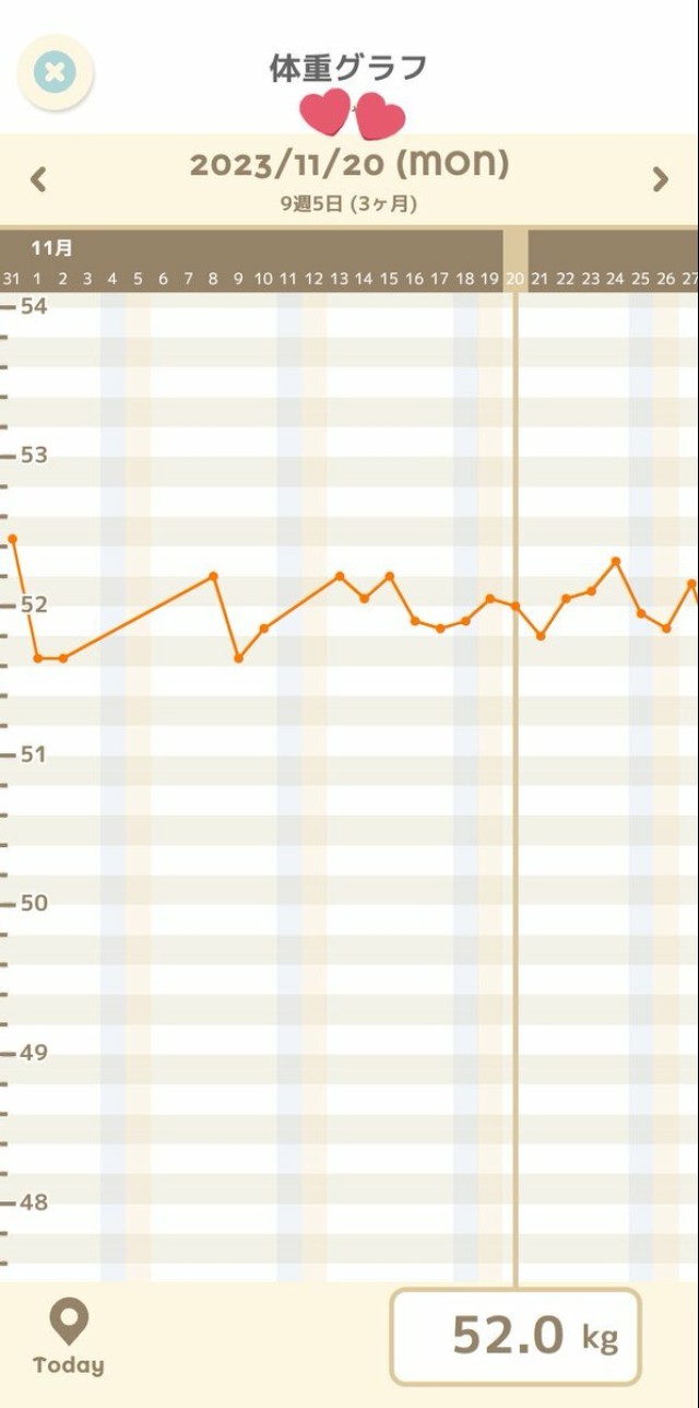 体重妊娠前+0.5kgで全然増えなーい 枠内に入らなーい? ?って言われたし増えりゃいいってもんでもないんだろうな〜?