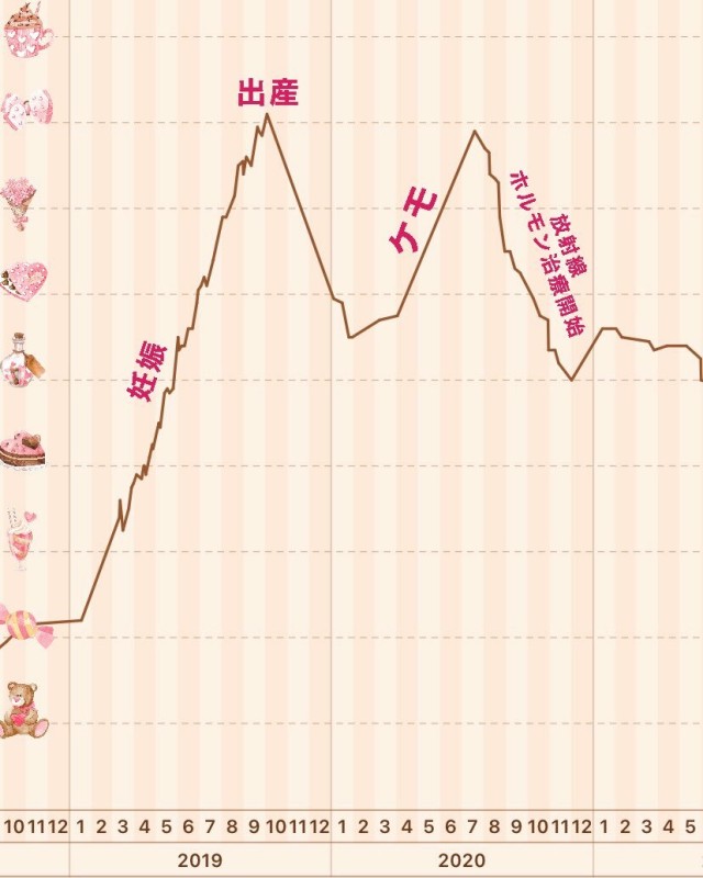 体重管理 【記録】 産後に残った妊娠太り(7kg)+ケモ太り(5kg)=12kg *ケモ副作用の5kgは浮腫みで、真夏に33回の放射線治療に通ううちに自然に落ちた *意外にもホルモン治療(タモキシフェン、リュープリン)での直接の体重増加はない *(やったね?)