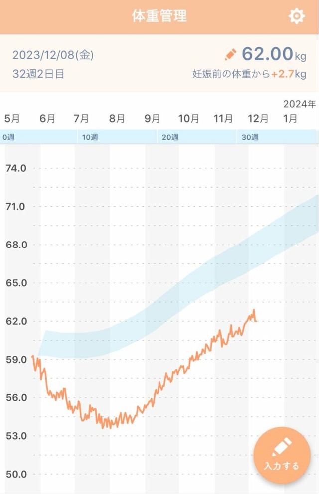体重管理 アプリだと妊娠前の体重と比較されてるけど母子手帳はつわりで痩せた体重からだから+8kgなんだよね。ややこし