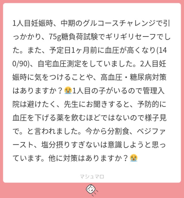 ご質問ありがとうございます! 詳細な経過が分からないので推測ですが、おそらく質問者様は前回の妊娠時に妊娠糖尿病にも妊娠高血圧症候群にもギリギリで引っかからなかったということですね。 この場合、質問者様がおっしゃっている「普段の食事に気を付ける」以上の対策は無いかなと思います。