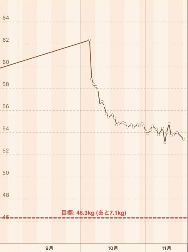 完全に下がりどまったよね?ちなみに目標体重は若かりし結婚式の時のもの(5年前)?妊娠前からはプラス3キロ。食べすぎてる自覚はあるんだ…でもお腹すくんだ…。気長にたけまり様と共に頑張るけど、モチベーション維持のためこちらで定期的に報告させてください?