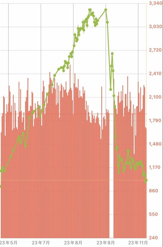 体重管理 あすけんの体重グラフ。 緑の折れ線が体重で、赤の棒が摂取カロリーなんだけど、妊娠後期は摂取カロリーが右肩下がりなのに、体重は右肩上がりなのウケる?