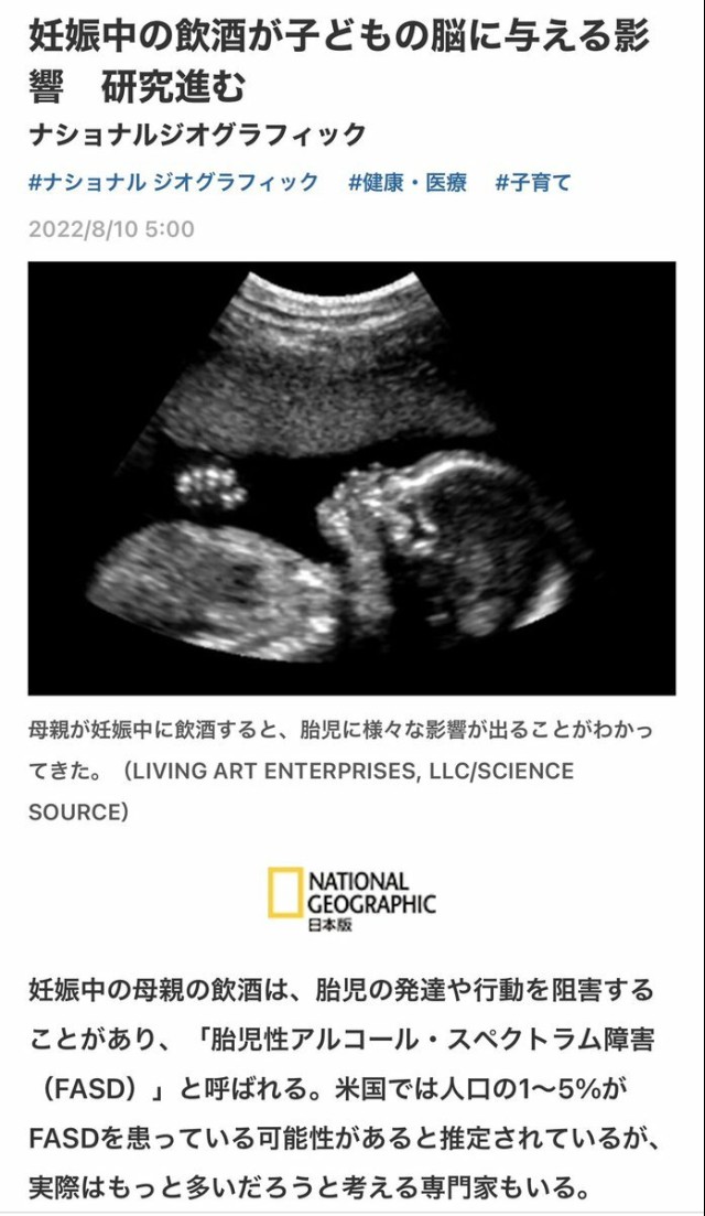 妊娠中の母親の飲酒は、胎児・乳児に対し、低体重や顔面を中心とする形態異常 脳障害などを引き起こす可能性。治療方法はなし。23年前の飲酒率は18%、今年23歳の18%は胎児アルコールスペクトラム可能性。