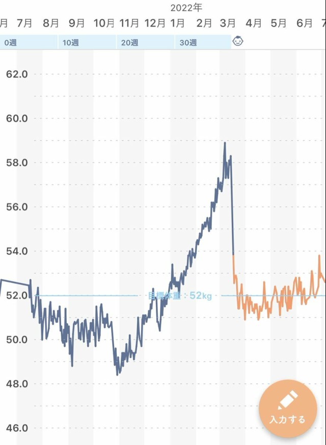 体重管理 1人目の妊娠中、予定日近づくにつれて水飲んだだけで体重増えてるんじゃないかと思ってたけど、今回はだいぶ緩やか? 夏だからかな?????
