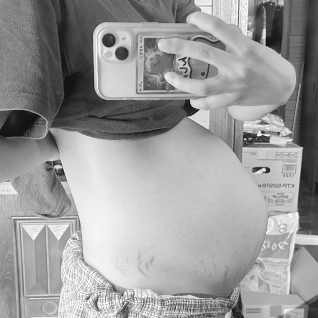 妊娠線バリバリ、体重10キロ増 予定日まであと2週間 頭まん丸ビックベビーちゃんもうでておいで??