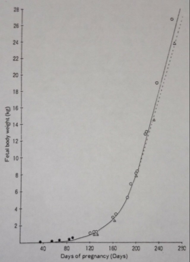 黒毛和種妊娠牛における胎子の体重の増え方を示されているグラフです(岡野、1994)。グラフ化されると、妊娠200日以降の増加はエグいですね…?妊娠末期の母牛は胎子育ての負担が多くなってます。