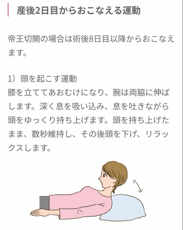 体重管理 【産後の体重経過】 産後9日目:(妊娠前+3.4kg) 昨日の予想通り、ほぼ下げ止まり?帝王切開後でも出来る産褥体操の一部を見かけたので、腹式呼吸とあわせてやってみる。産褥体操、帝王切開後は2−3週間経ってから徐々に、とのことなので産後ケア施設から戻ってくるタイミングで始める