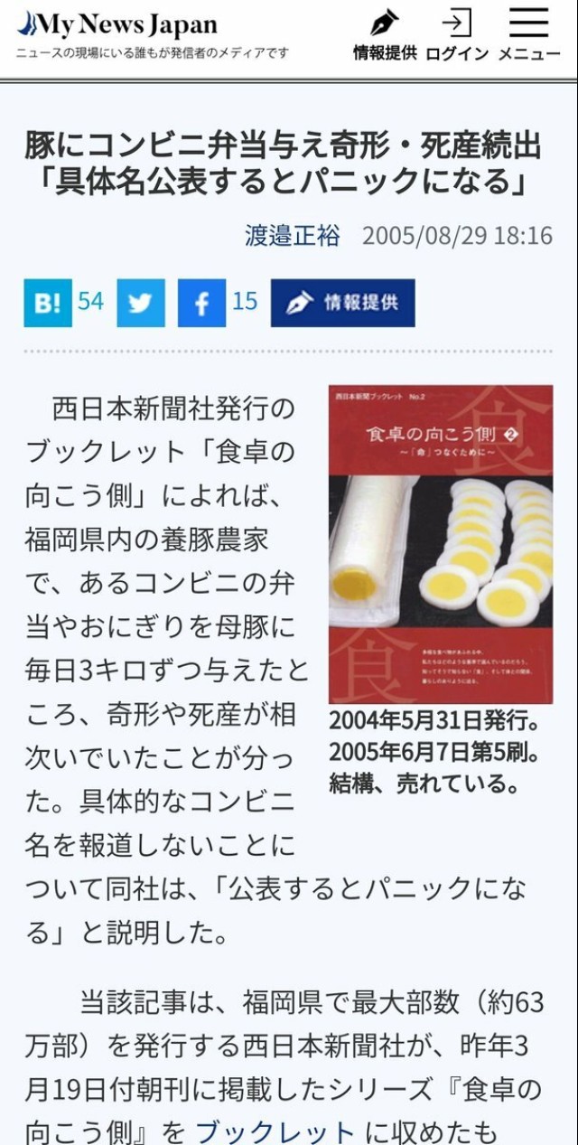 妊娠中の食事 ある養豚農家での事件 豚の妊娠期間である114日前から 餌として全ての食事を コンビニの廃棄弁当を与えていた所、死産、奇形、虚弱な子豚、 羊水がコーヒー色に濁っていたり… 元の食事に戻すと、お産も正常に戻った 母豚の食べる量は 約一日3㎏ 人間はこれほどは食べないが