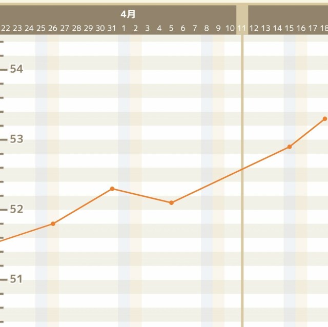 体重管理 上がり方見たかったからつわりで減った後の数値を妊娠前の体重に設定して順調に右肩上がり!最近食べれない期だけど、胃が空いてきた頃が怖いらしいから備えないと?