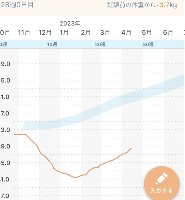 体重管理 体重、 悪阻で減りすぎて今もずっと気持ち悪くて正直何も食べたくない…量の多い食べ物を目の前に出されると「ウッ」ってなる でも前回は後期に増えたからここからの伸びしろ(?)に期待してる?