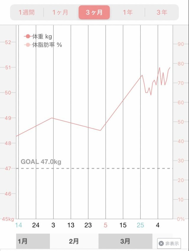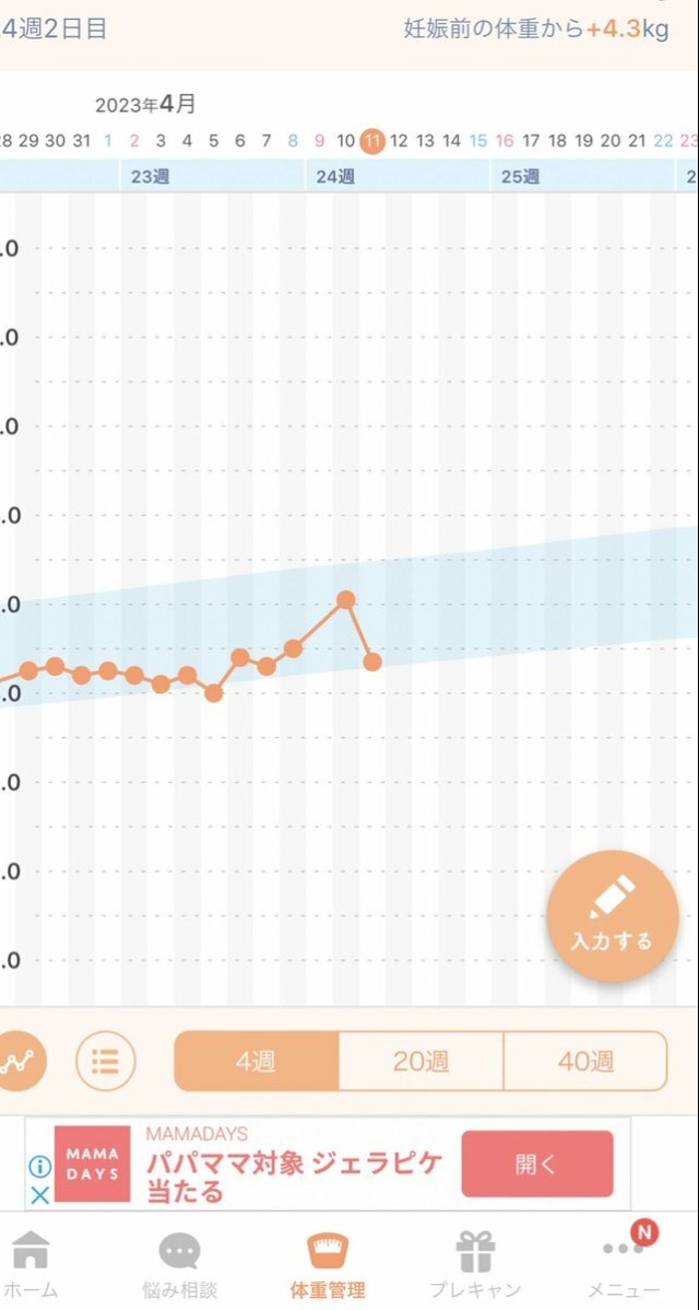 体重管理 体重は体重アプリに記録していくことにした! ここ1ヶ月でめちゃ太ったんだな… 妊娠前は46-47キロくらいでした