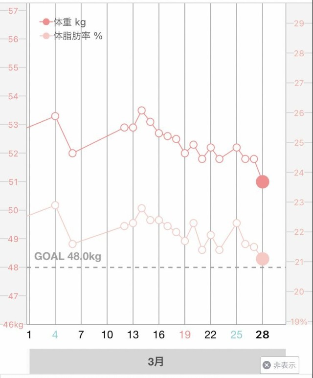 体重管理 妊娠しやすいっていうBMI22(57kg)を目指して体質改善中だけど、食べれてないしプロテインすら規定量飲めてないから体重減ってきてる? 今BMI19.7?(51kg・体脂肪21%) 筋トレは頑張ってるから体脂肪減って筋肉は変わらないかついてきてると思う 55kg・体脂肪24%の時よりは健康になってる気がする☺️