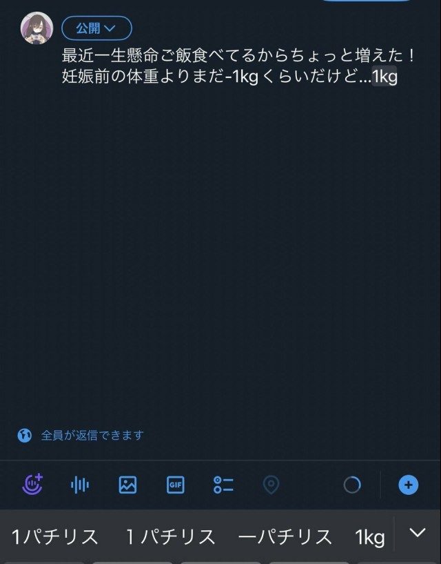 体重管理 最近一生懸命ご飯食べてるからちょっと増えた!妊娠前の体重よりまだ-1kgくらいだけど… てかこの予測変換何wwパチリスて、、、