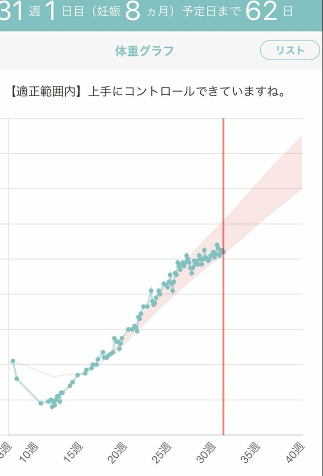 体重管理 ←①実際の妊娠前の体重を設定した場合 →②1人目妊娠前の体重を設定した場合() なんだけど結構グラフが違う? ①はぽちゃだけど人生で一番長い期間の体重で、②はダイエットやや頑張りめで自分の中でスタイル良い体重。今ちょうどどちらもOK範囲だけど、左の範囲を下回らないほうがいいのかな?