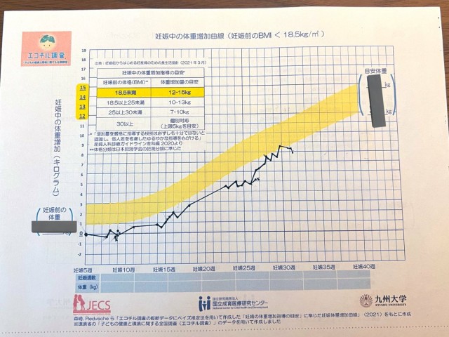 体重管理 うーん…嫁のをプロットしたが、カロリー足らんのかなぁ…充分満腹させとるけど。 資料はネット上のこちらから拝借しました。トツキトオカのだと分かりにくいんで… → 10万人の妊婦健診情報から「妊娠中の体重増加曲線」を作成 | 妊娠中の体重管理の参考になることを期待 | .jp/press/2021/210