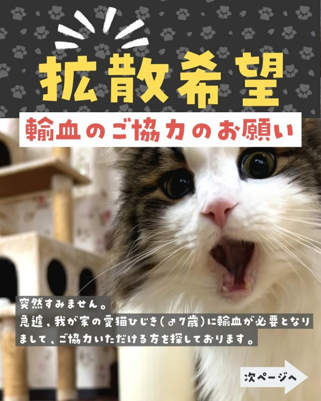 体重管理 【拡散希望】 埼玉県川口市のどうぶつの総合病院まで来て頂ける方の中で、以下の輸血に必要な条件に一致する猫ちゃんを飼われている方はいらっしゃらないでしょうか? ・年齢1歳~5歳くらいまで ・体重3キロ以上 ・腫瘍やウイルス性疾患の既往歴なし ・過去に妊娠したことが