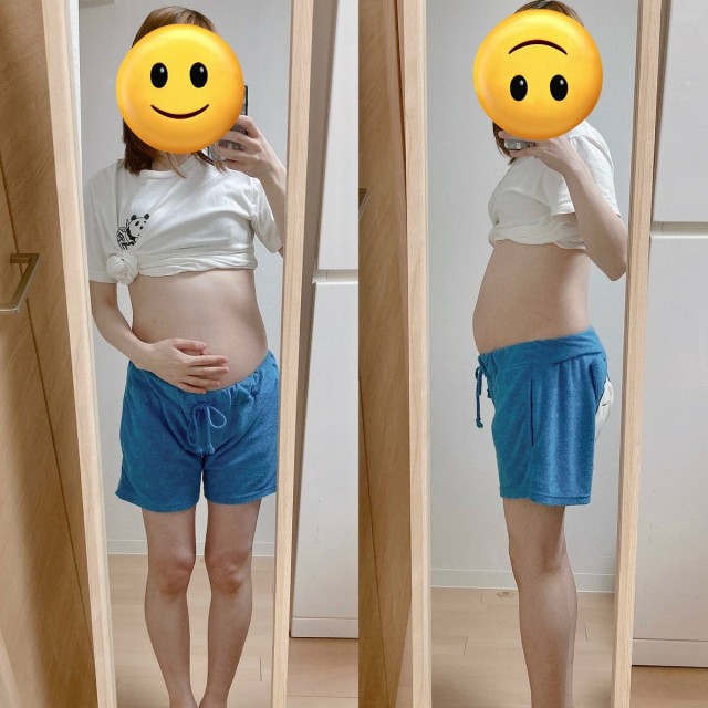 体重管理 予定日2カ月前(妊娠8カ月)に撮った前からと横からの写真?体重増え過ぎたら安産出来なくなるって言うから最近糖質制限してるけどなまらつらい??