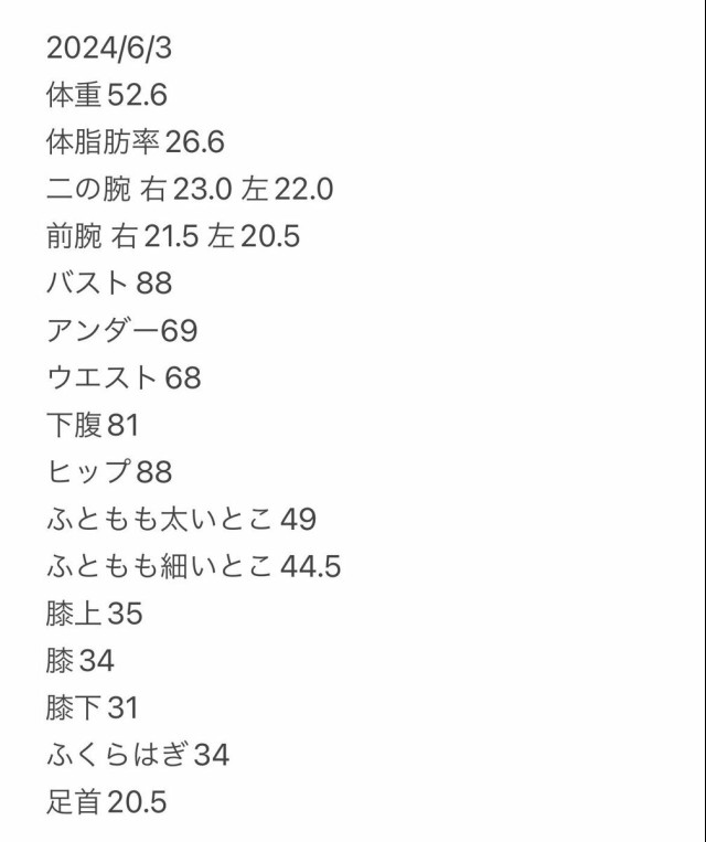 戒めに貼っておく今日のボディサイズ計測! ちなみに2枚め(妊娠中除いて)過去一太ってた去年の夏(実際はこれでも体重軽い日)