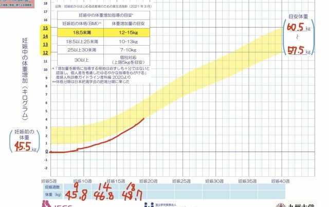 体重管理 昨日体重計乗ったら、妊娠前から+4キロになってて焦った???しかも、この1週間で+1キロ! 産院初診の時、先生に◯キロまで増えてOKって言われた気がするけど、全く覚えてなくて(笑) 妊娠前のBMI改めて計算して、グラフつけたけど、今のところ体重の増え方許されるレベル、、だよね、、???