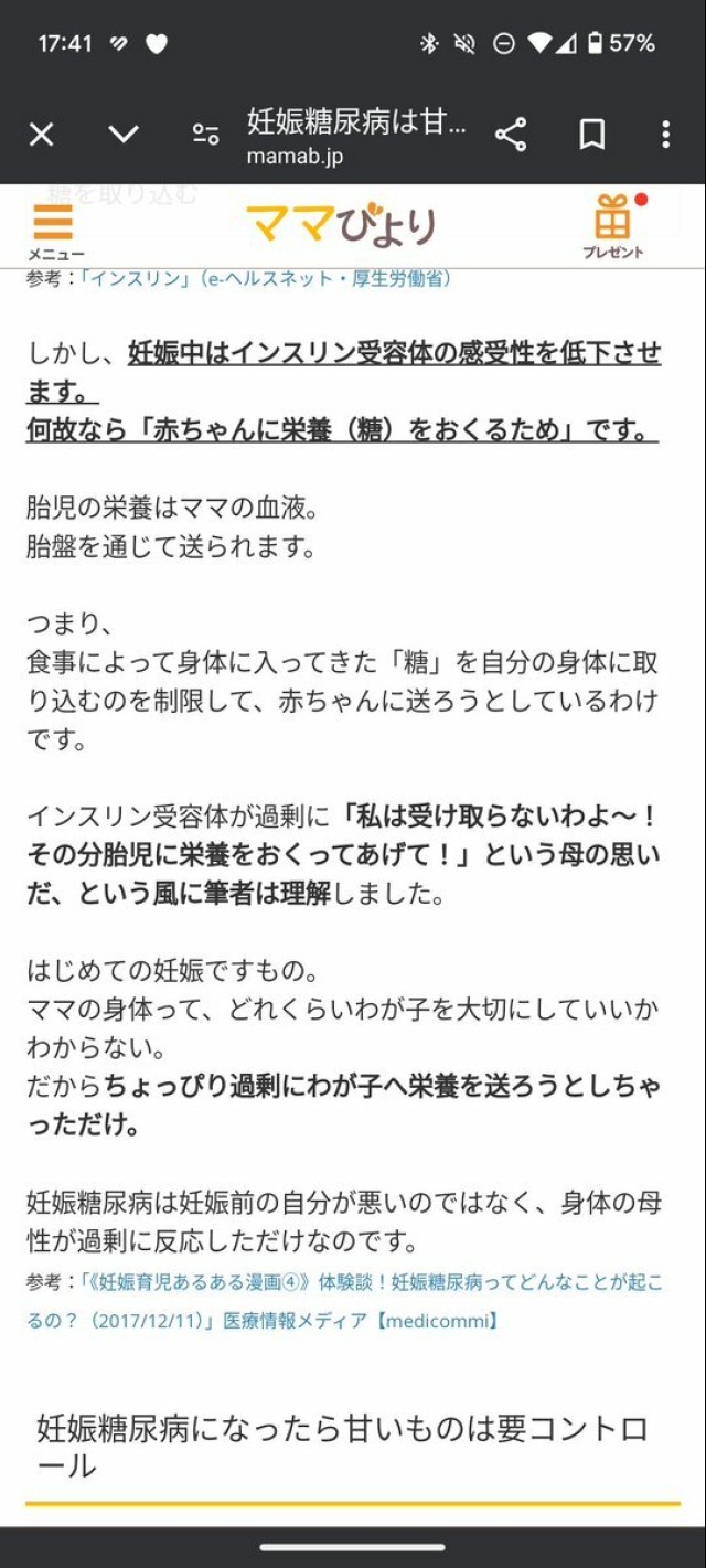 妊娠中の食事 赤ちゃんに糖分(エネルギー)を送るために、血中の血糖値が高くなりすぎてしまうのが妊娠糖尿病の原因らしい。 甘いもの極力減らすのは糖尿病と診断されてからでも良さそうなんだよな〜 お医者さんにもそう言われた? インスリン抵抗性の問題だから過度に食事気にしないで〜みたいな。